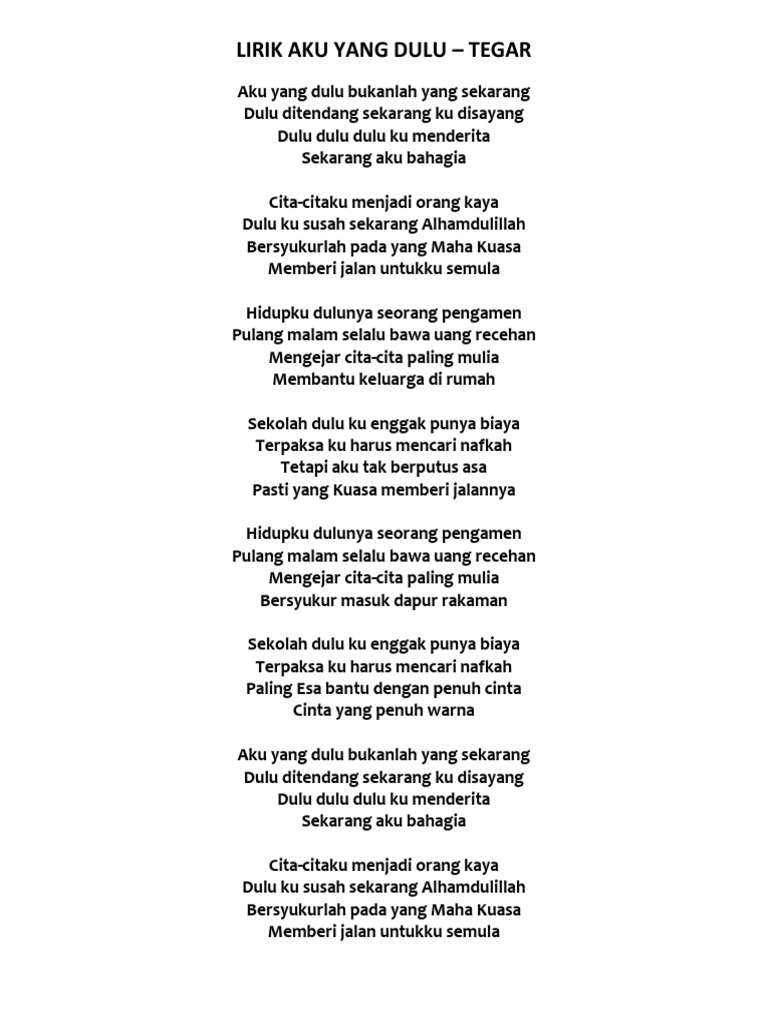 Dulu dulu dulu ku menderita Sekarang aku bahagia Cita citaku menjadi orang kaya Dulu ku susah sekarang alhamdulillah. Seluruh media termasuk syair lirik lagu ringtone kord kunci gitar serta video klip Lirik Lagu Tegar - Aku Yang Dulu yang tersedia di situs ini tentang lirik lagu Lirik Lagu Tegar - Aku Yang Dulu hanyalah untuk keperluan. LIRIK LAGU TEGAR - AKU YANG DULU Unknown di 0127 Ku yang dulu bukanlah yang sekarang Dulu ditendang sekarang ku disayang Dulu dulu dulu ku menderita Sekarang aku bahagia Cita-citaku menjadi orang kaya Dulu ku susah sekarang Alhamdulillah Bersyukurlah pada yang Maha Kuasa Memberi jalan untukku semua Hidupku dulunya seorang pengemis.